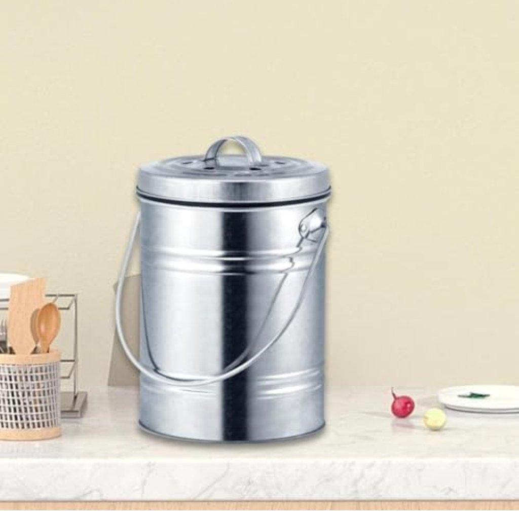 Compact countertop compost bin designed to collect kitchen scraps with a lidded top.